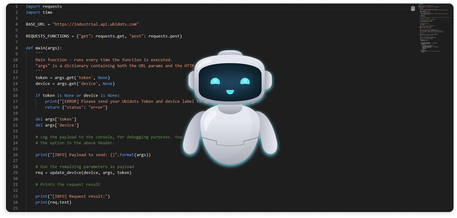 The AI Assistant is built with developers in mind. Each UbiFunction has its own chat thread, so your interactions stay focused and persistent. The assistant has been trained on Ubidots-specific knowledge and supported libraries, giving it the precision to help with everything from basic syntax to advanced use cases. With this new addition, writing and managing UbiFunctions just became smarter and a lot more seamless.