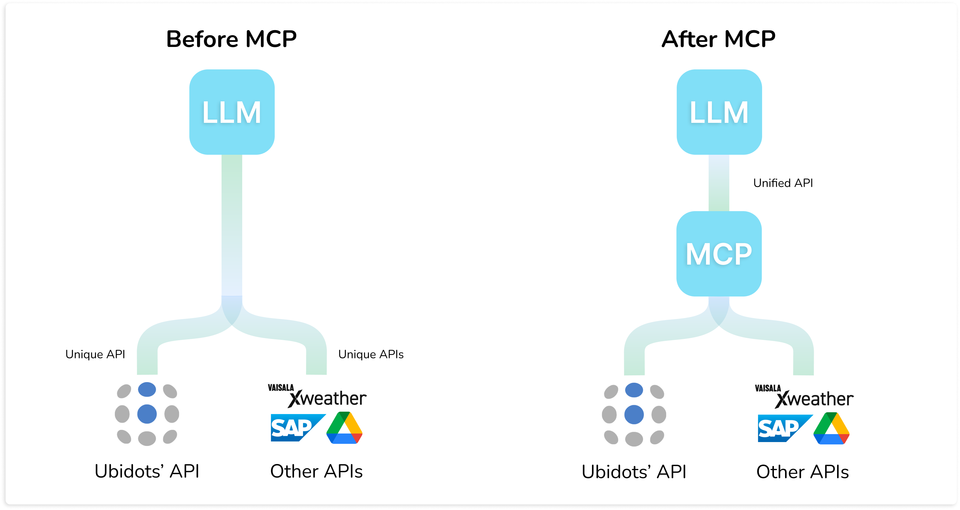 Before MCP, every API (Ubidots, XWeather, SAP…) needed its own custom integration with an LLM. Now, every API supporting MCP will talk a unified API language, with prebuilt "tools" that LLMs can dynamically call depending on the conversation context. Just attach our new Ubidots MCP to your next AI assistant and let your users interact with your IoT data through natural conversations.
